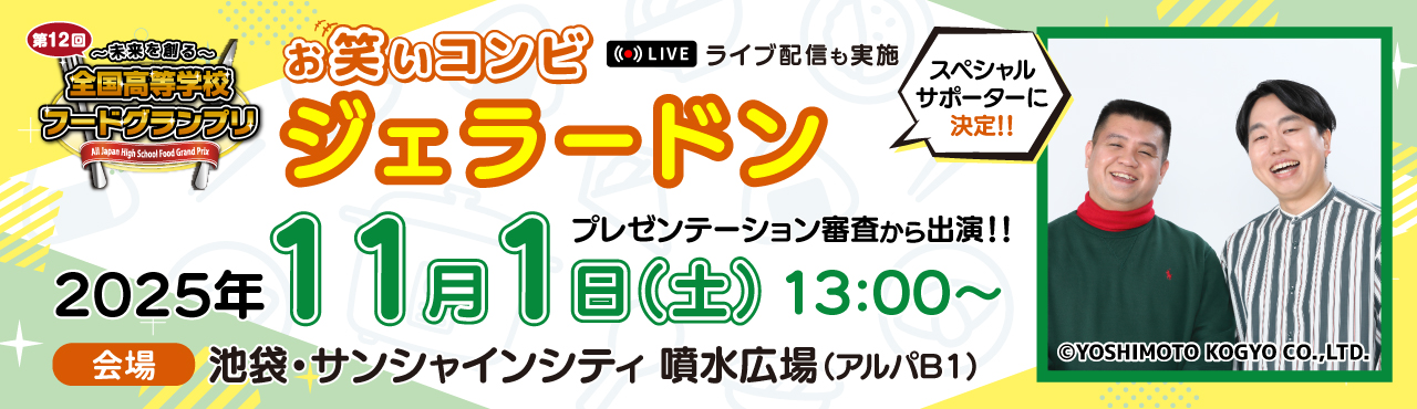 本コンテストは、高校生が地域の特産品を使ってメーカーと共同開発した食品を全国から募集し、開発商品のNo.1を決定する大会です。11月1日(土)に「池袋・サンシャインシティ 噴水広場(アルパB1)」で行われる本選では、審査員による試食審査およびプレゼンテーション審査を経て、グランプリが決定します。今回、本選会場を盛り上げていただく「スペシャルサポーター」として、テレビをはじめとするメディアに多数出演しているジェラードンの出演が決定しました。本選に進出した6校が試行錯誤の末に開発した商品や、チャレンジ部門およびマーケティング部門の優秀企画校が日頃の学びを活かして生み出したアイデアは必見です!また、生徒とスペシャルサポーターのやりとりにも是非ご注目ください!